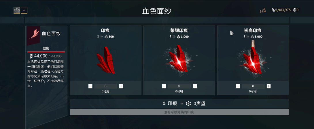 无论是开宝箱、打比赛、等军团交易还是蹲商城,这东西都不是随随便便就能到手的,得做好长期投入的准备。想靠商城买的话,平时那些普通任务和活动就得勤快点做,一点一滴地把星石和钻石攒起来,指不定哪天商城刷出来你就能立刻拿下。还有个辅助法子,就是加入血色面纱集团后,记得在战甲上装备他们的专属纹章。这样以后你做任务时,每次都能顺带蹭到一点血色面纱声望,虽然单次给的不多,但日积月累也能提升你在集团的地位,对获取集团相关物品包括印痕也有潜在帮助。
