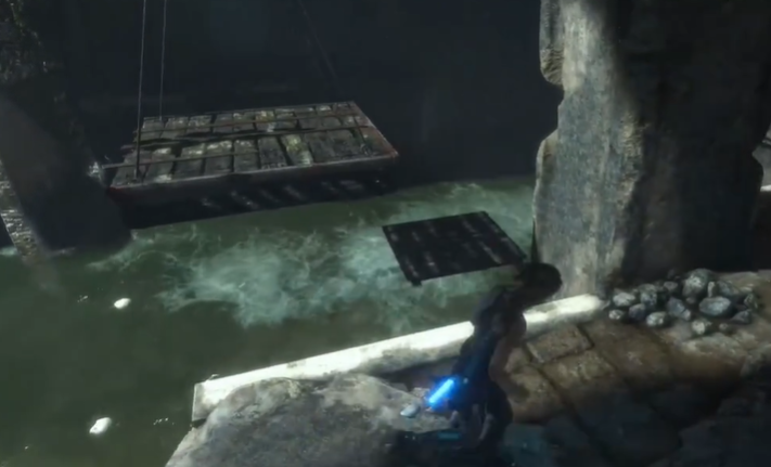 跳进水里,游到木筏边上,把它朝着水流的方向踢过去,让它漂到那扇紧闭的门附近。接下来就得动用劳拉的标志性装备——绳索箭矢了。瞄准门上方的那个绳索桩,一箭射过去,把木筏和桩子给连上。这个连接是后续所有动作的基础,它保证了木筏的移动能转换成拉开机关的力。搞定了这个,你就爬上旁边的平台,找到一个控制水流的开关,用力把它拉下来,接下来就等着看水位变化带来的连锁反应了。