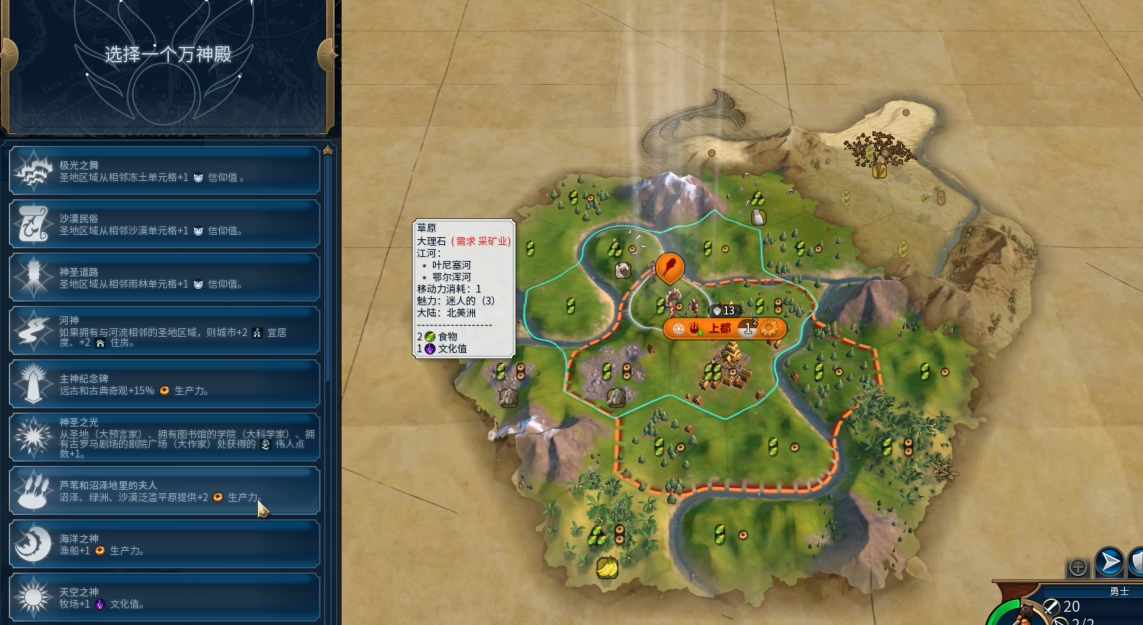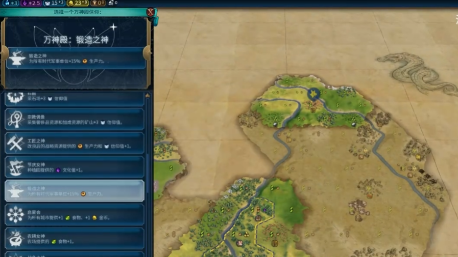 如果你开局瞄了一眼自家地盘,发现有那么两三个牧场,那天空之神就非常值得你优先考虑了。它的效果是牧场提供+1文化。早期文化的珍贵程度有时候甚至超过科技,因为文化决定了你解锁市政树的速度,而市政树里的政治哲学能给你多开政策槽,封建主义能增加建造者使用次数,这些都对铺城和发展至关重要。在还没造出纪念碑的那段文化真空期,两个牧场就能让你的文化产出翻倍,大大加速你拿到关键政策的进程。政策快了,你就能更早挂上加快科技或生产力的卡片,这相当于从另一个维度给科研加了速。