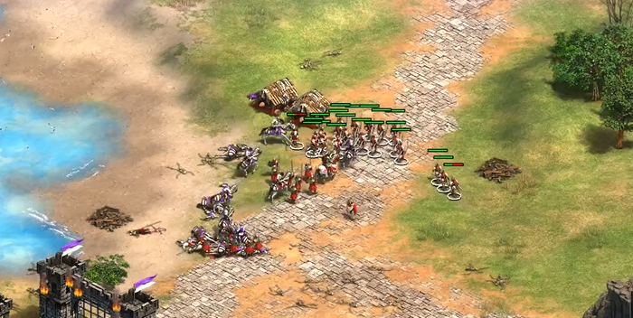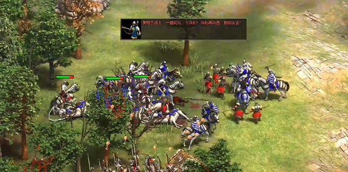 在接近12点钟方向,你会遇到一群法兰西骑士,包括12个骑士和一个圣殿骑士,旁边木栅栏里藏着投石机。调整队形很重要,让步兵和骑兵围住长弓兵和僧侣,派一个骑兵去勾引敌人出来,他们一冲锋就用你的单位硬扛,僧侣继续补血,长弓兵猛射,轻松解决后砸开木栅栏,亨利五世靠近投石机就能收为己用。有了投石机,沿途的箭塔和城堡都不是问题,沿着大路向下推进,确保亨利五世安全。