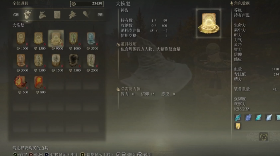 购买群体恢复祷告的具体步骤包括与柯林对话后选择学习祷告选项,然后在弹出的菜单中浏览可用祷告列表,找到大恢复并确认购买。玩家需要支付一定数量的卢恩作为费用,这些卢恩可通过击败敌人或完成任务积累。完成后,祷告会立即添加到玩家的库存中,随时可在装备菜单中使用。