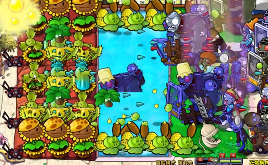 防御布局需精心规划,泳池中间和外侧各布置一列磁力坚果来吸收伤害,保护后排脆弱植物。磁力坚果应错开种植,避免被群体击破导致防线崩溃。前排需保持坚果墙的完整性,一旦被破坏及时修补,防止僵尸快速突入。这种分层防御体系能有效应对快速突进的雪橇僵尸,确保整体防线的稳定性。