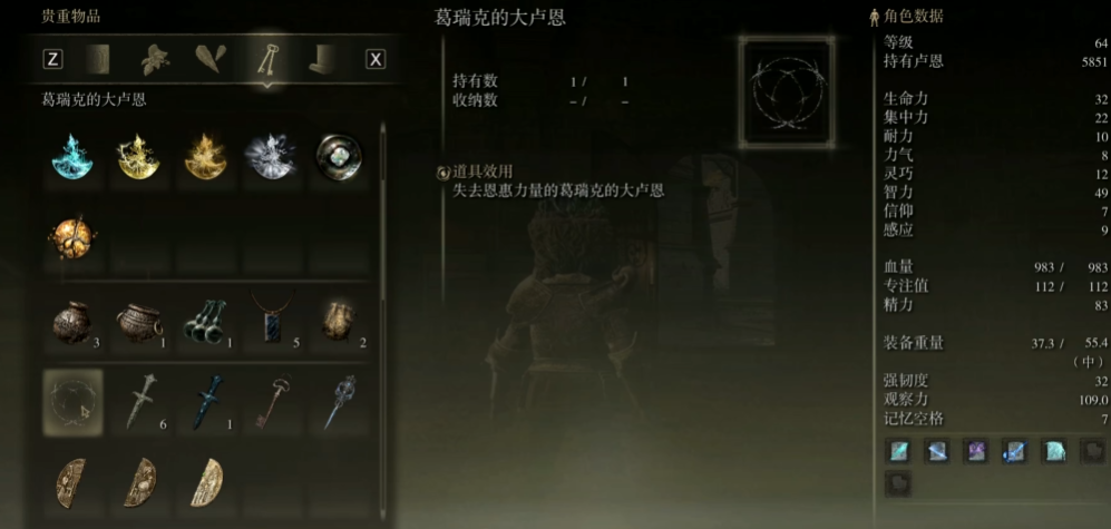 大卢恩是击败特定半神后获得的强大符文,激活后能为玩家提供临时增益效果,但激活过程需要前往对应的神授塔并完成特定步骤。玩家需要击败持有大卢恩的Boss,如葛瑞克或拉塔恩,以获取符文本身;必须前往该Boss关联的神授塔塔顶,在赐福点休息并选择装备大卢恩。这一步是激活的基础,装备后大卢恩不会立即生效,还需要使用道具卢恩弯弧来释放其力量。